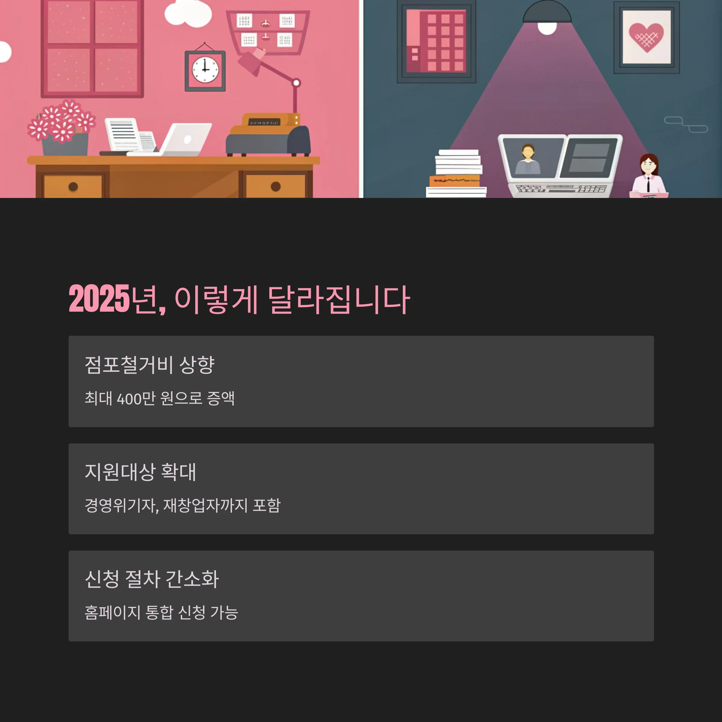 종합 재기 플랫폼입니다. 2025년부터는 지원금, 지원대상, 신청방식 모두 강화되었고