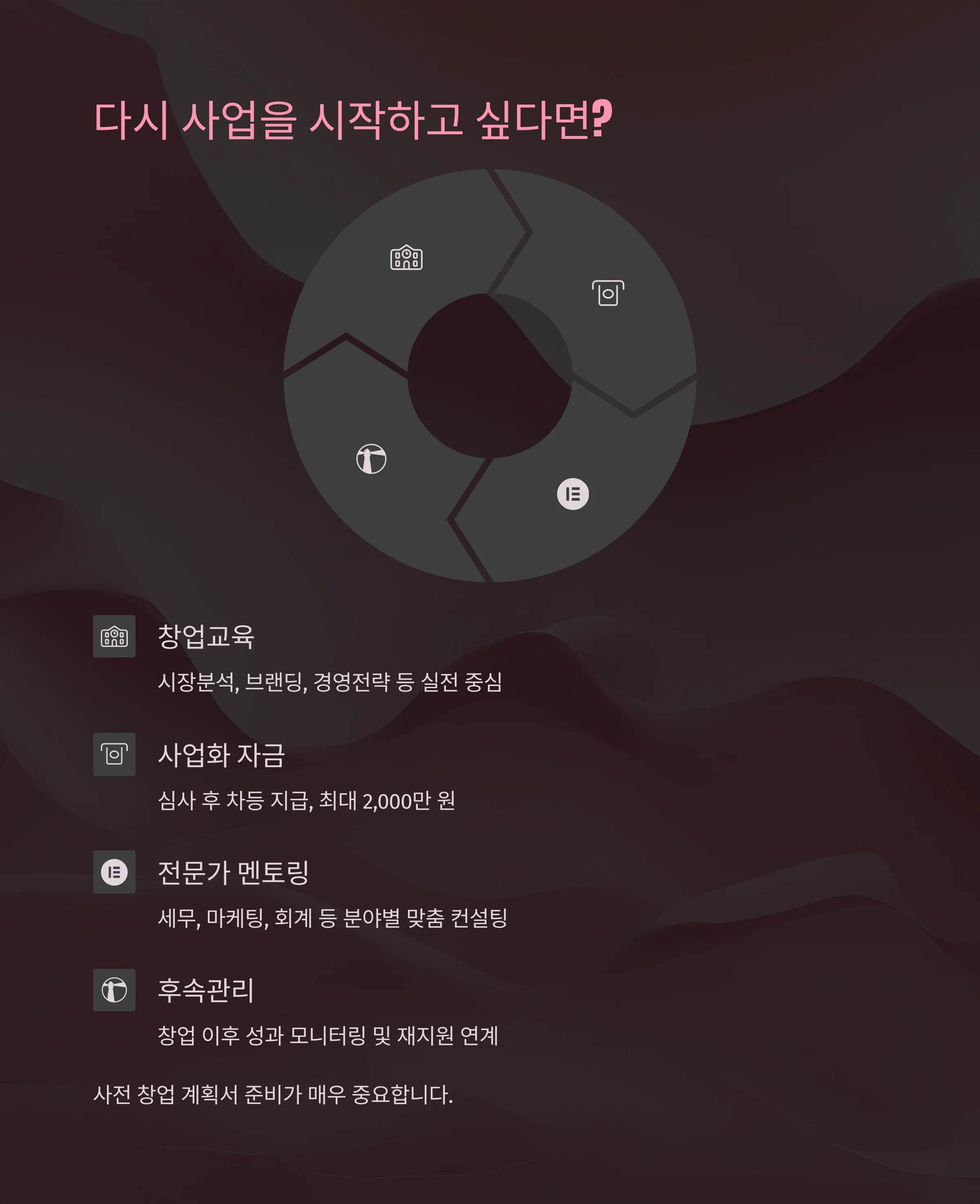 폐업 후 재기를 꿈꾸는 분을 위한 전문 재창업 프로그램입니다.