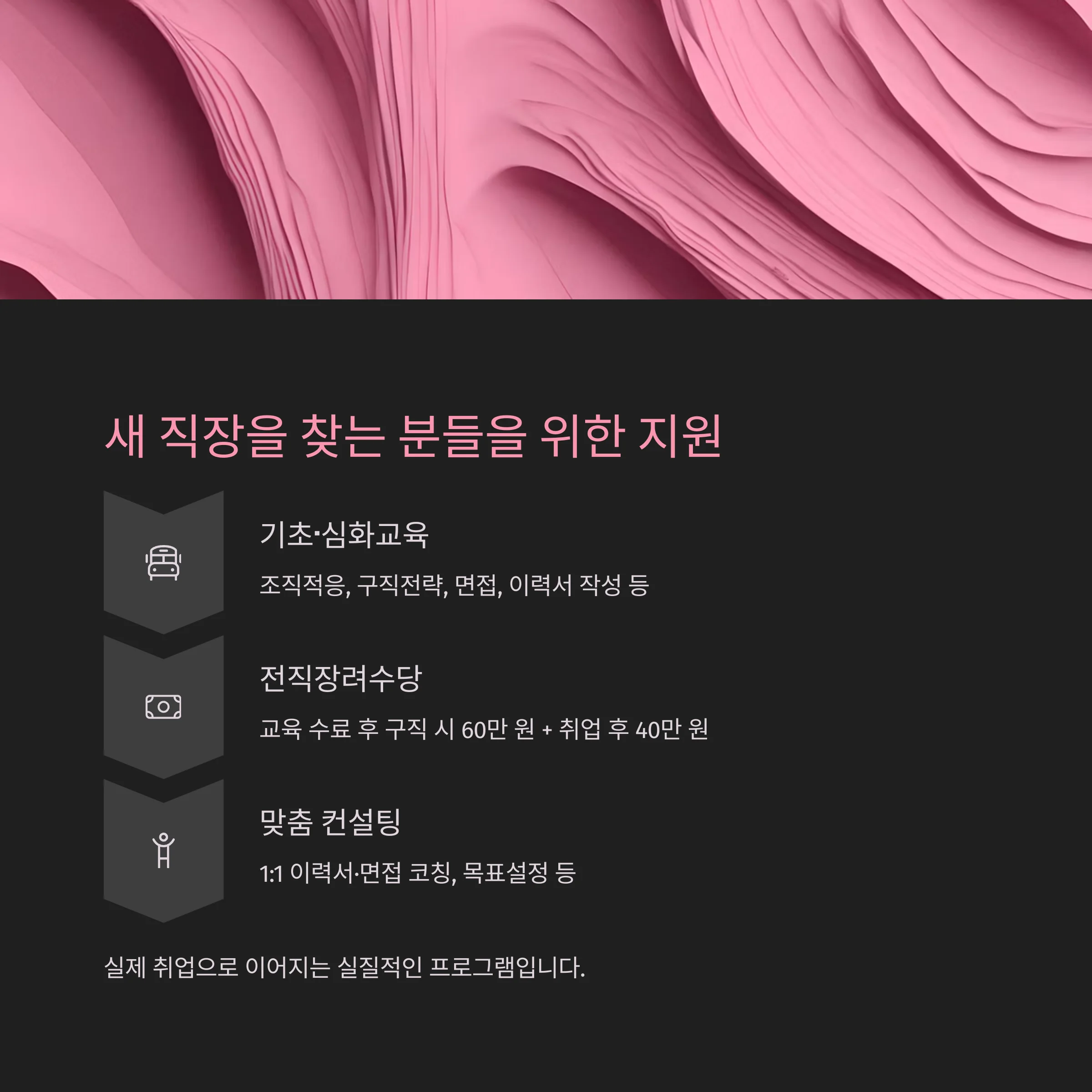 단순 구직지원이 아닌 재도약 기반 교육과 현장 실습까지 포함된 전직 패키지입니다.