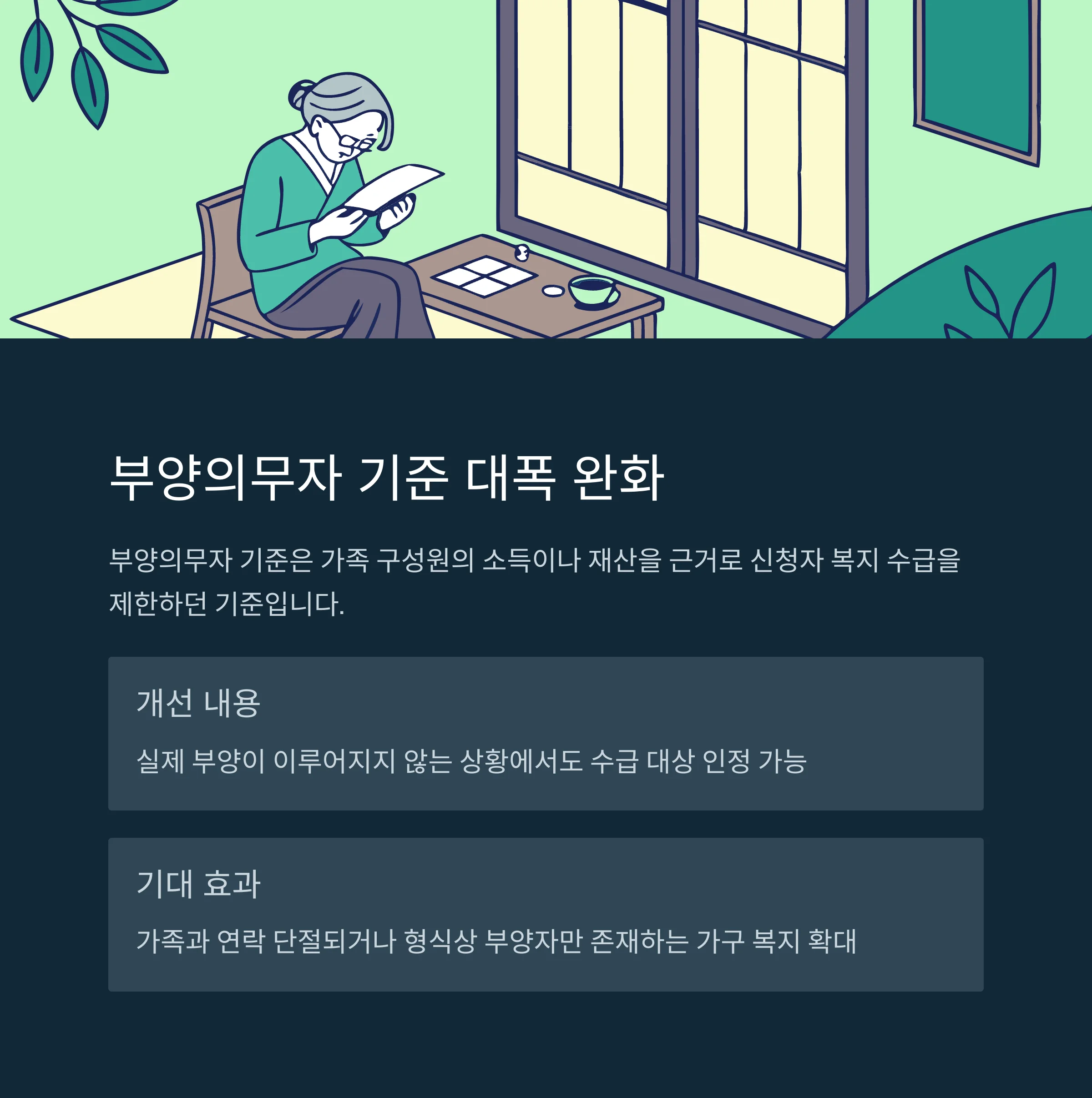 | 부양의무자 기준 완화 | 가족이 있지만 실질 부양받지 못하는 가구의 복지 접근성 향상 |