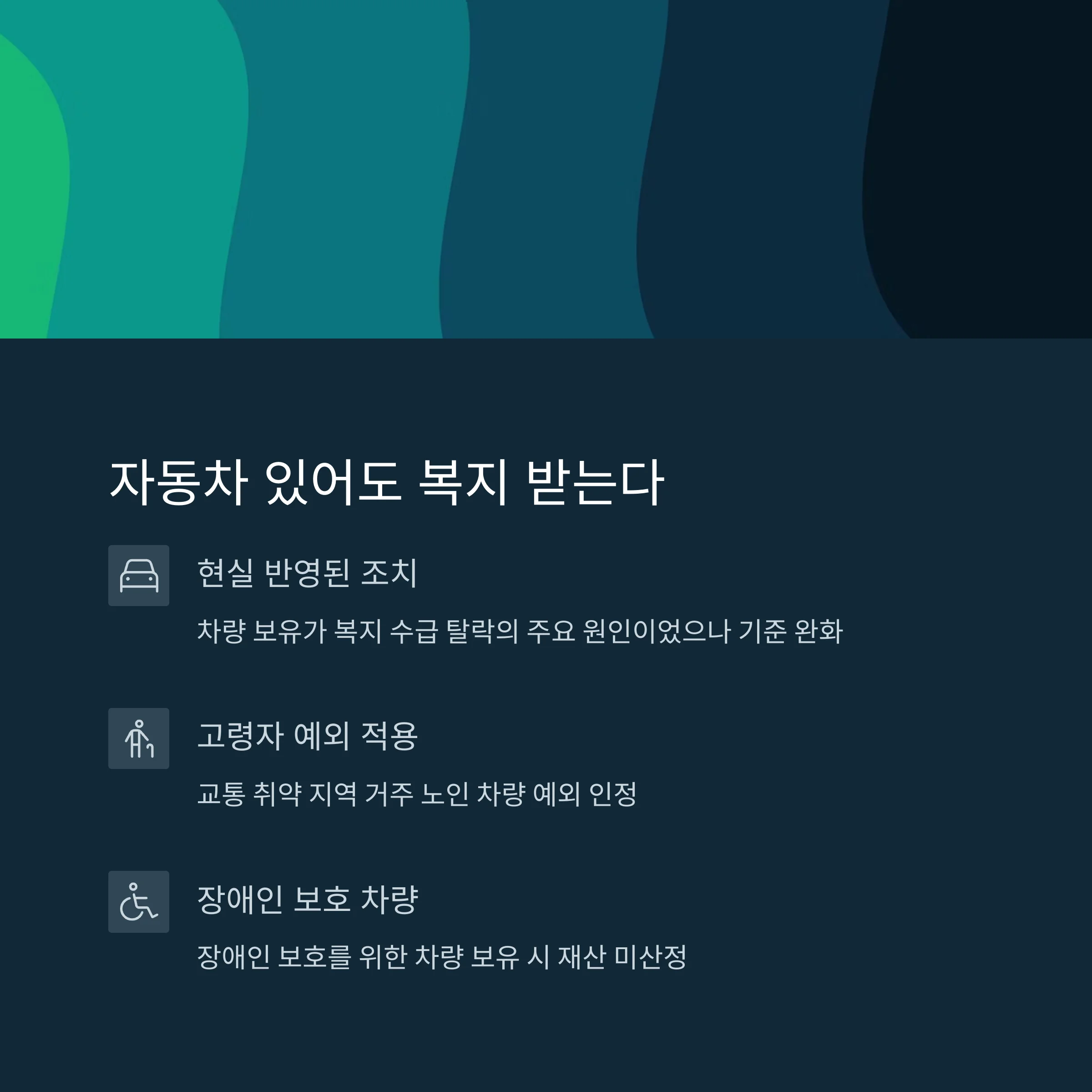 | 자동차재산 기준 완화 | 차량 보유로 인한 부적절한 탈락 사례 감소 |