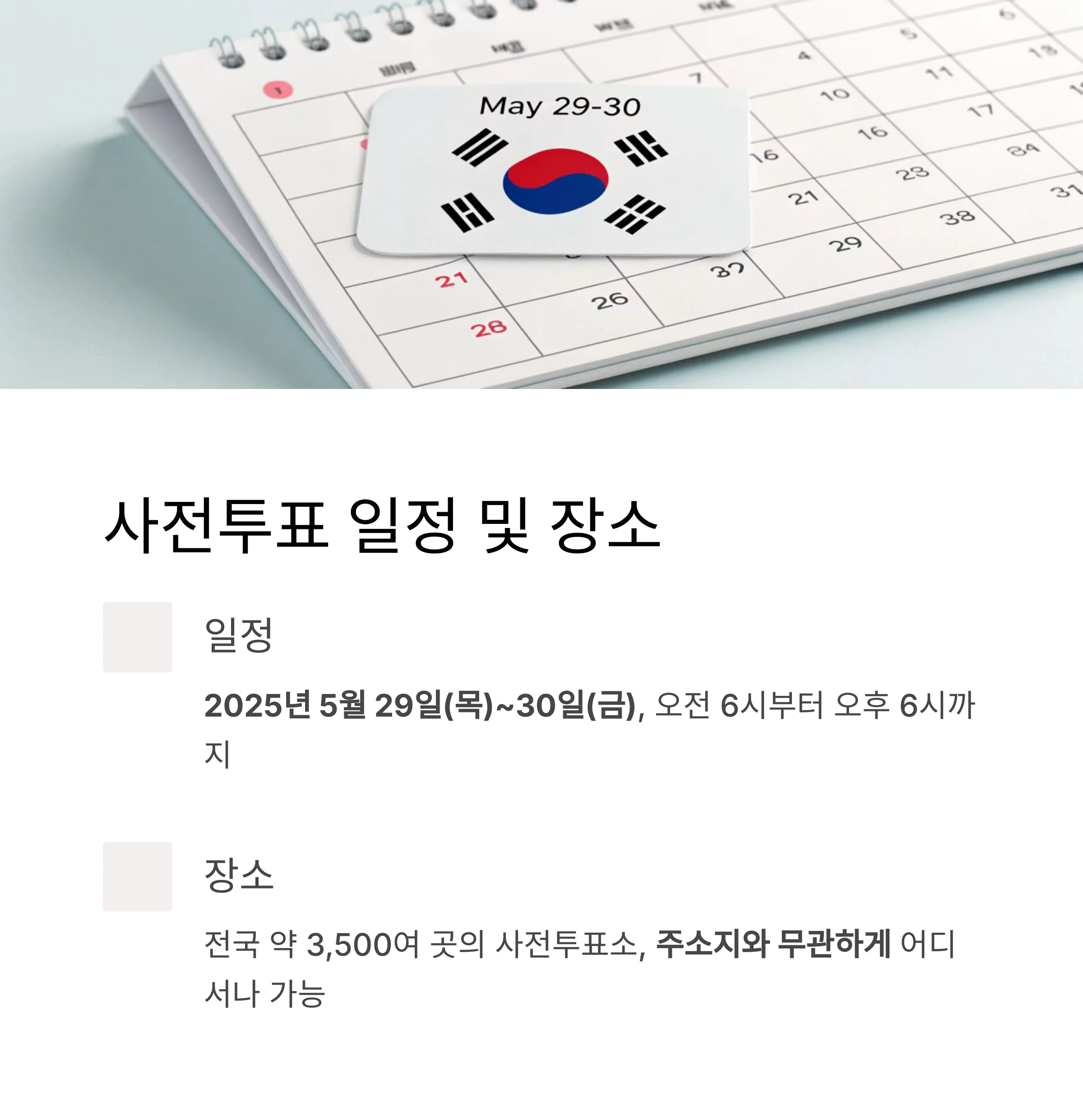 | 2025 사전투표소 찾기 방법과 빠르게 끝내는 투표 절차 정리 (0) | 2025.05.28 |