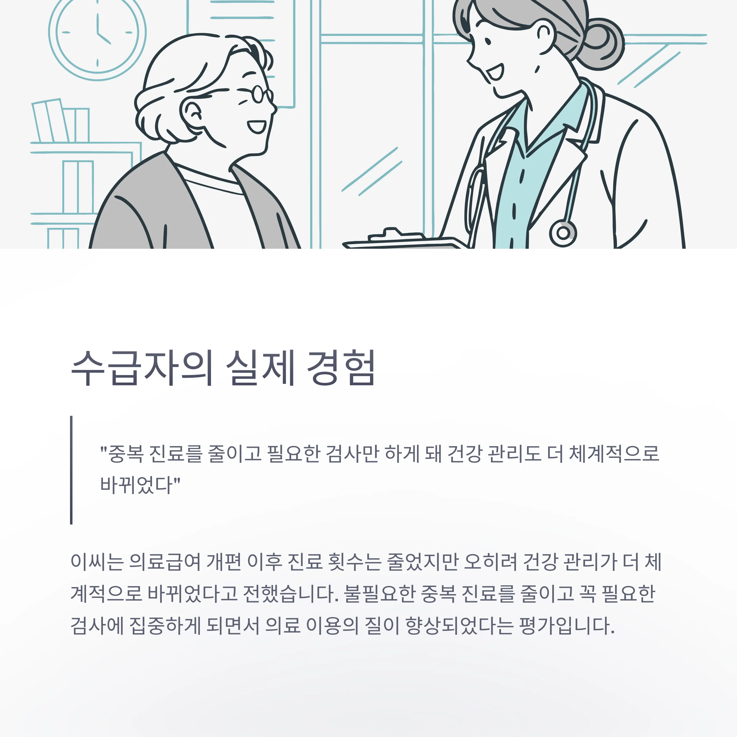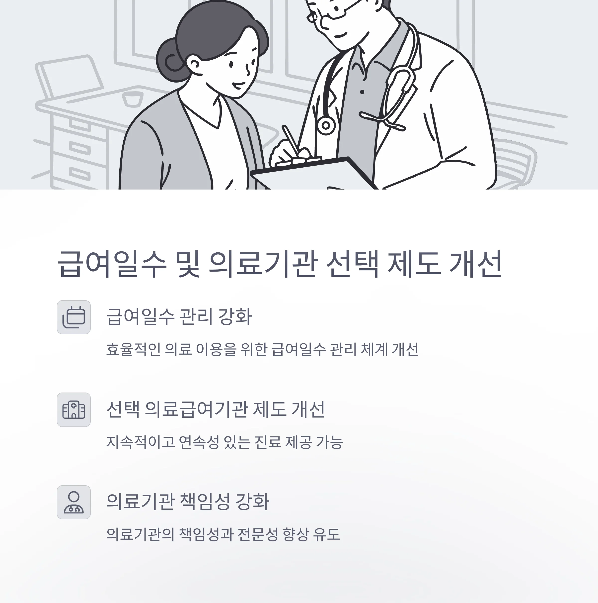 의료서비스의 과잉 이용을 억제하고, 수급자의 의료 접근성과 재정 지속 가능성 사이의 균형을 맞추는 개편이 이루어집니다.