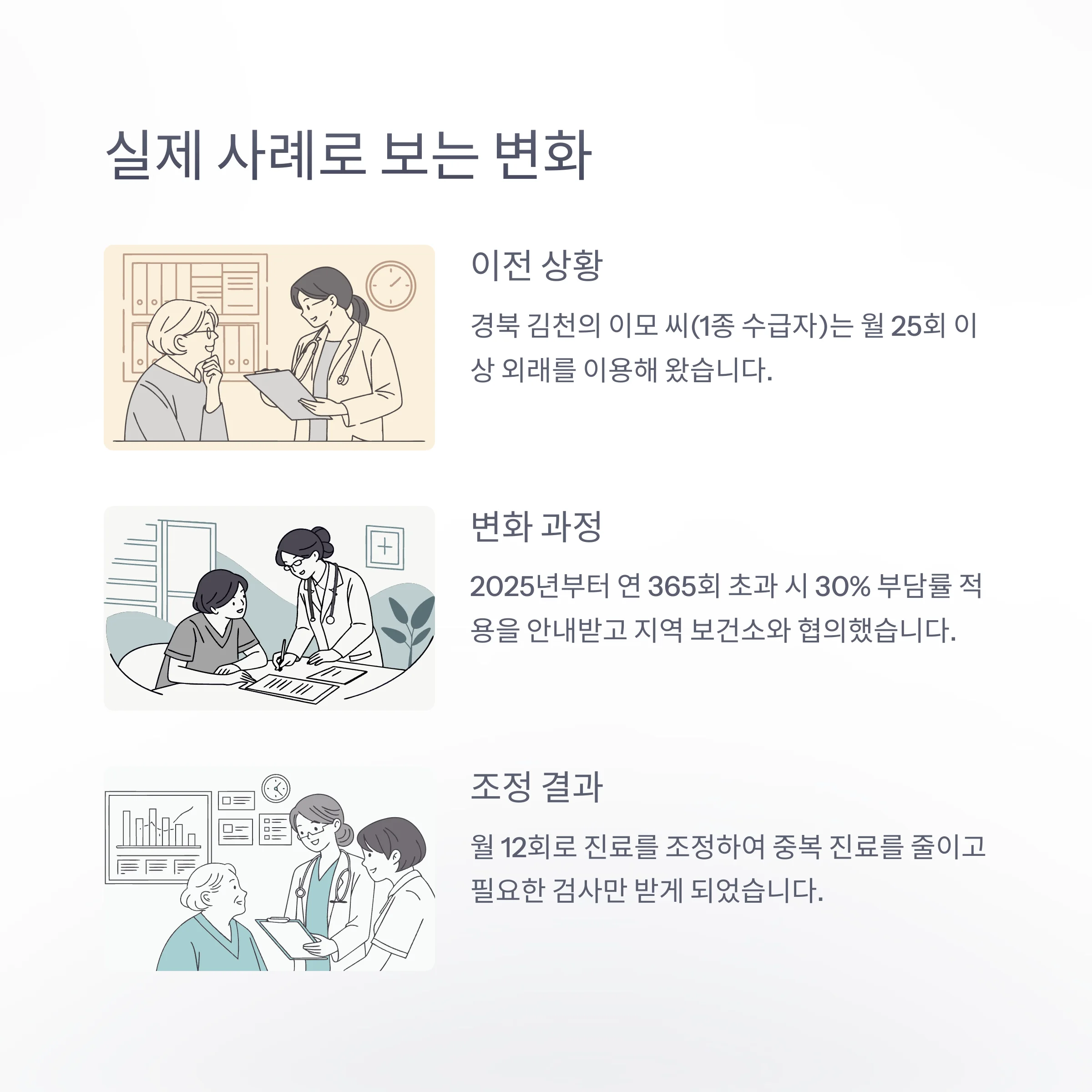 연간 외래진료 횟수가 365회를 초과할 경우, **초과 건부터는 본인부담률이 무려 30%**까지 적용됩니다.