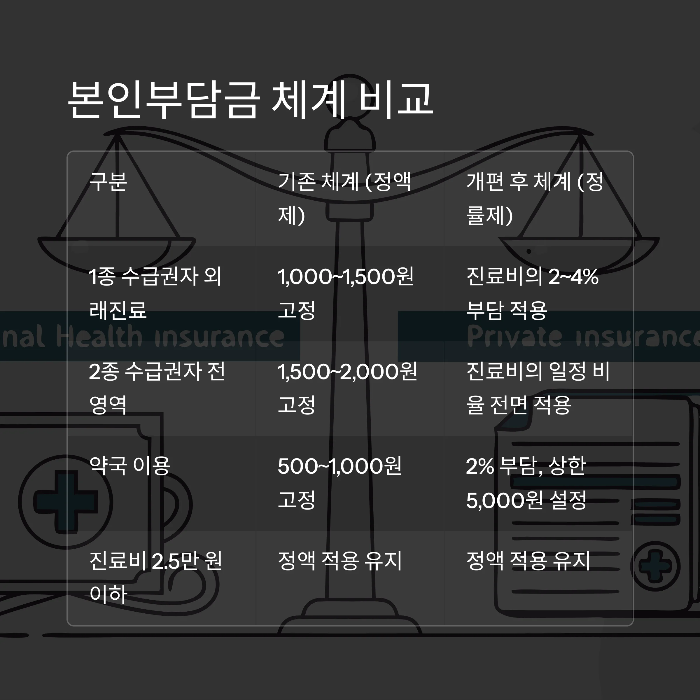 | 2종 수급권자 전 영역 | 1,500~2,000원 고정 | 진료비의 일정 비율 전면 적용 |