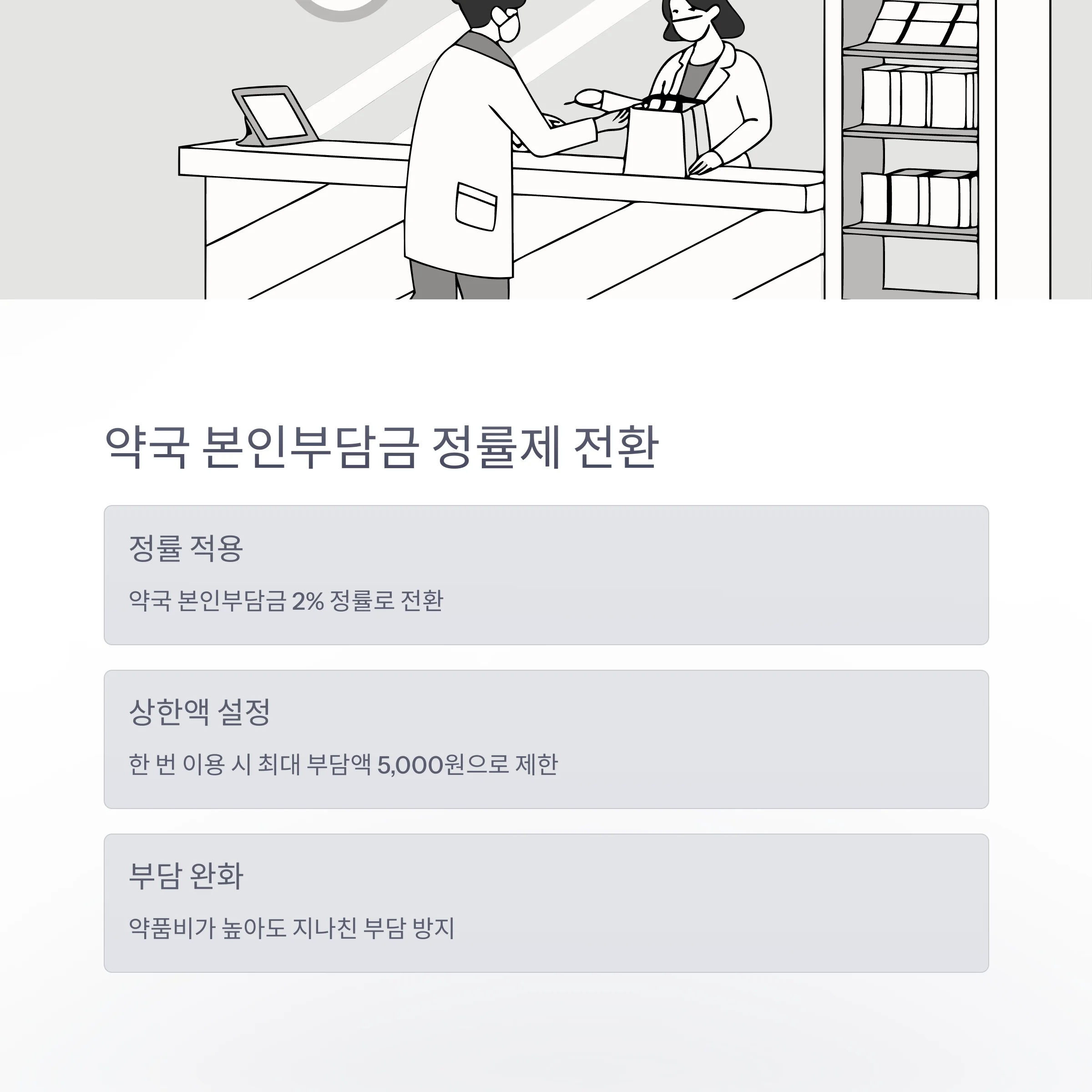 | 약국 이용 | 500원~1,000원 고정 | 2% 부담, 상한 5,000원 설정 |