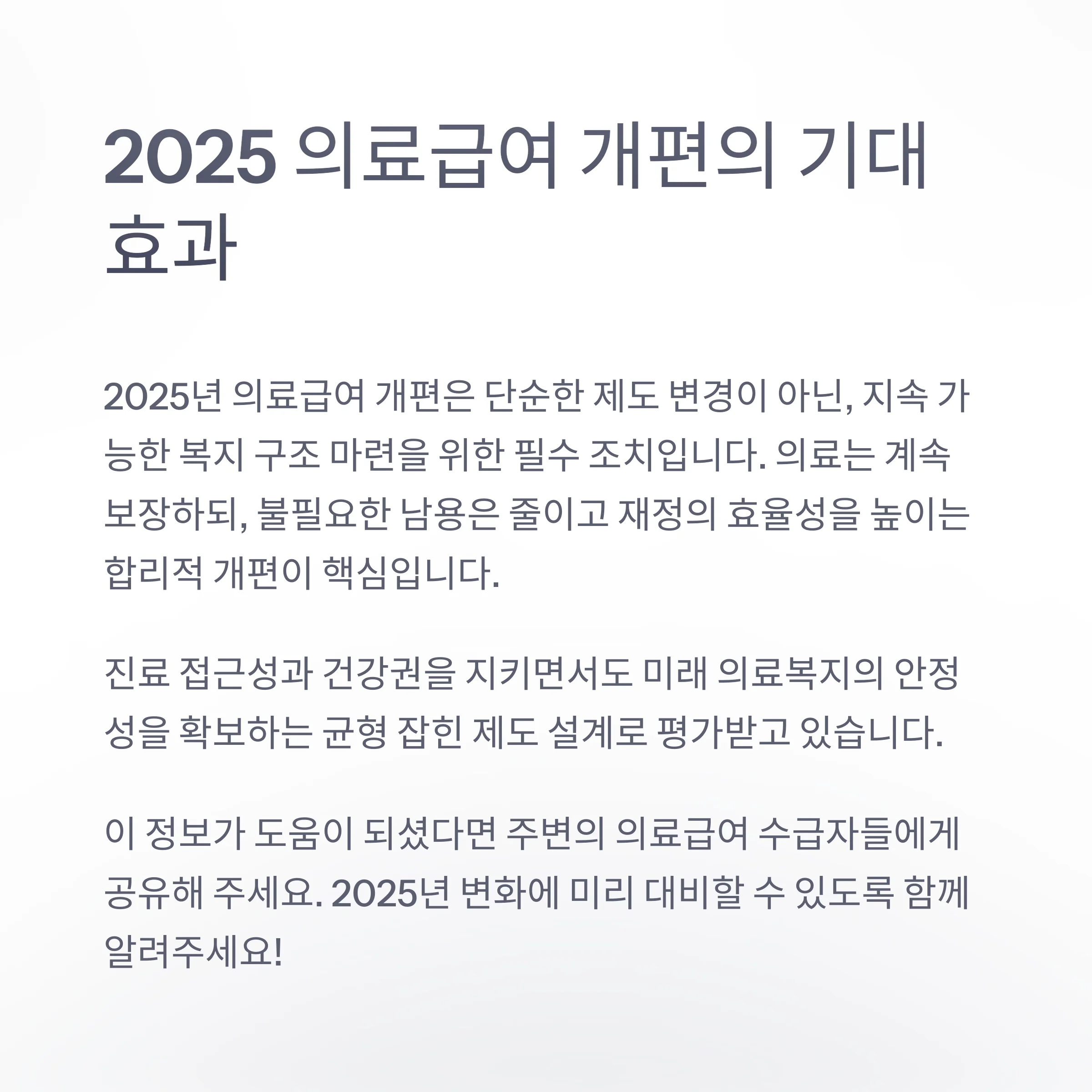 2025년 의료급여 개편은 단순한 제도 변경이 아닌, 지속 가능한 복지 구조 마련을 위한 필수 조치입니다.