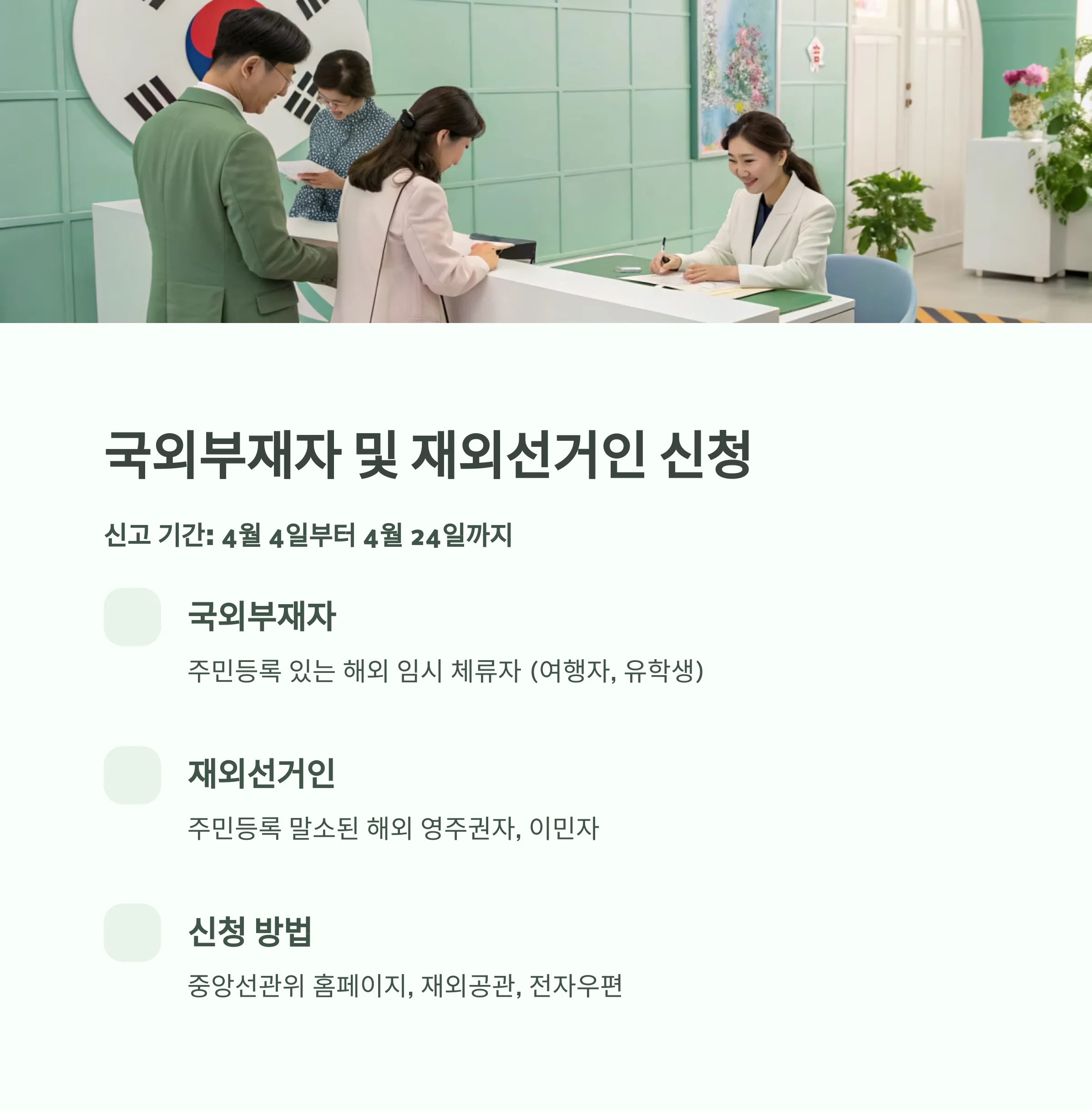 | 국외부재자 신고 | ~ 4월 24일 | 미신고 시 투표 불가 |