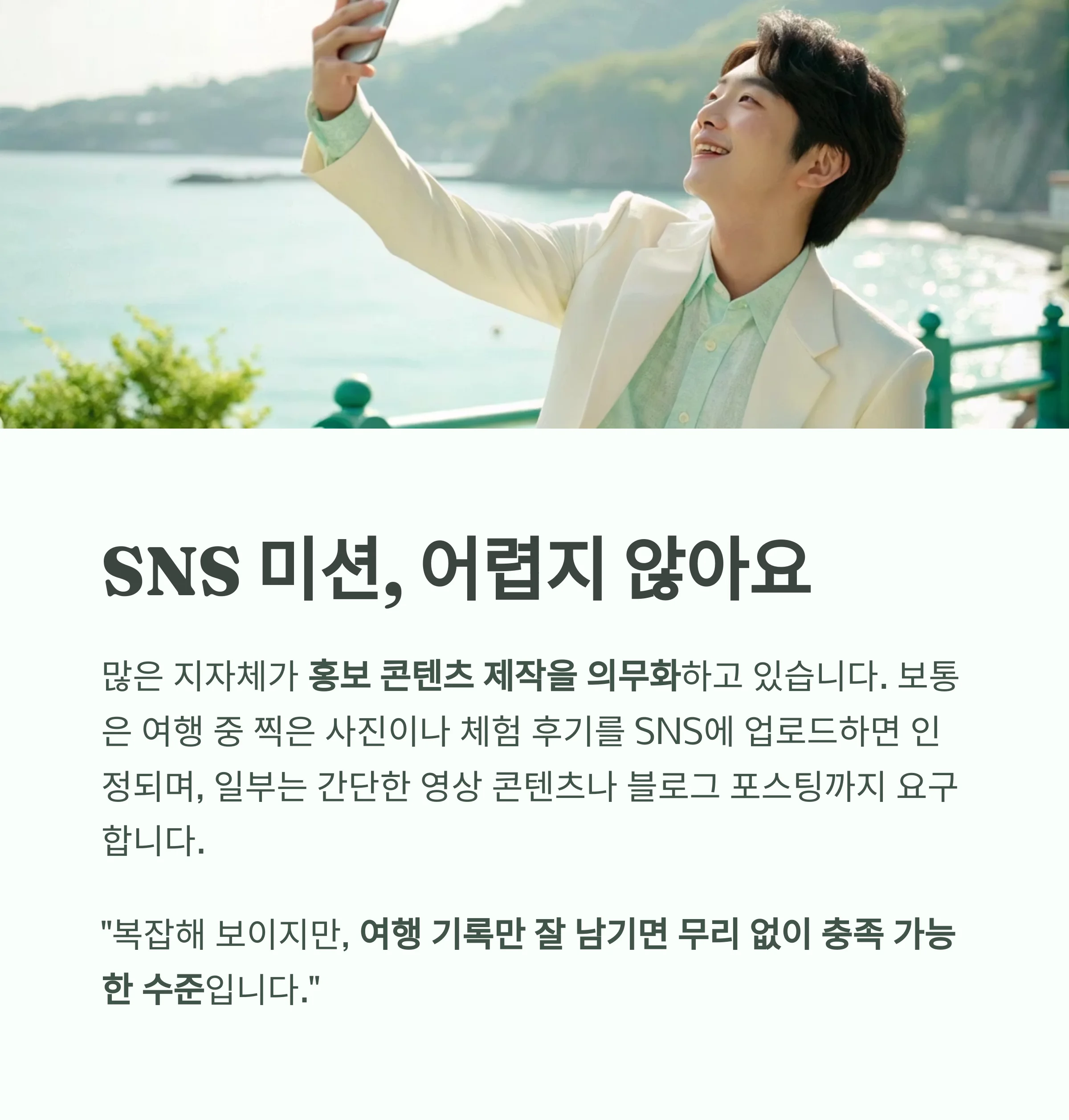 2025년 청년여행지원금은 단순한 여행 경비 지원을 넘어, 지역 체험과 콘텐츠 제작, 심지어 장기 체류까지 포함된 기회입니다.
