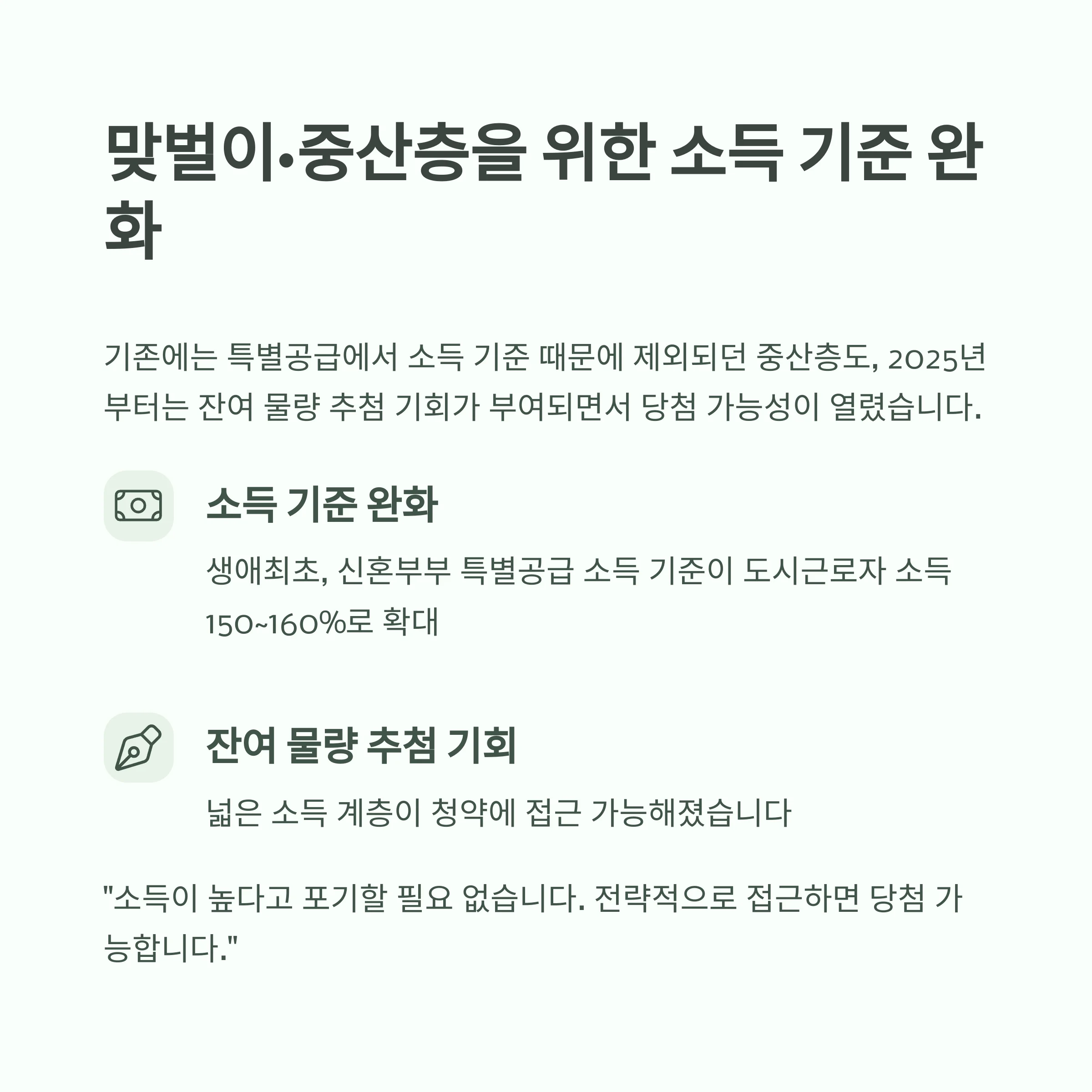 "소득이 높다고 포기할 필요 없습니다. 전략적으로 접근하면 당첨 가능합니다."