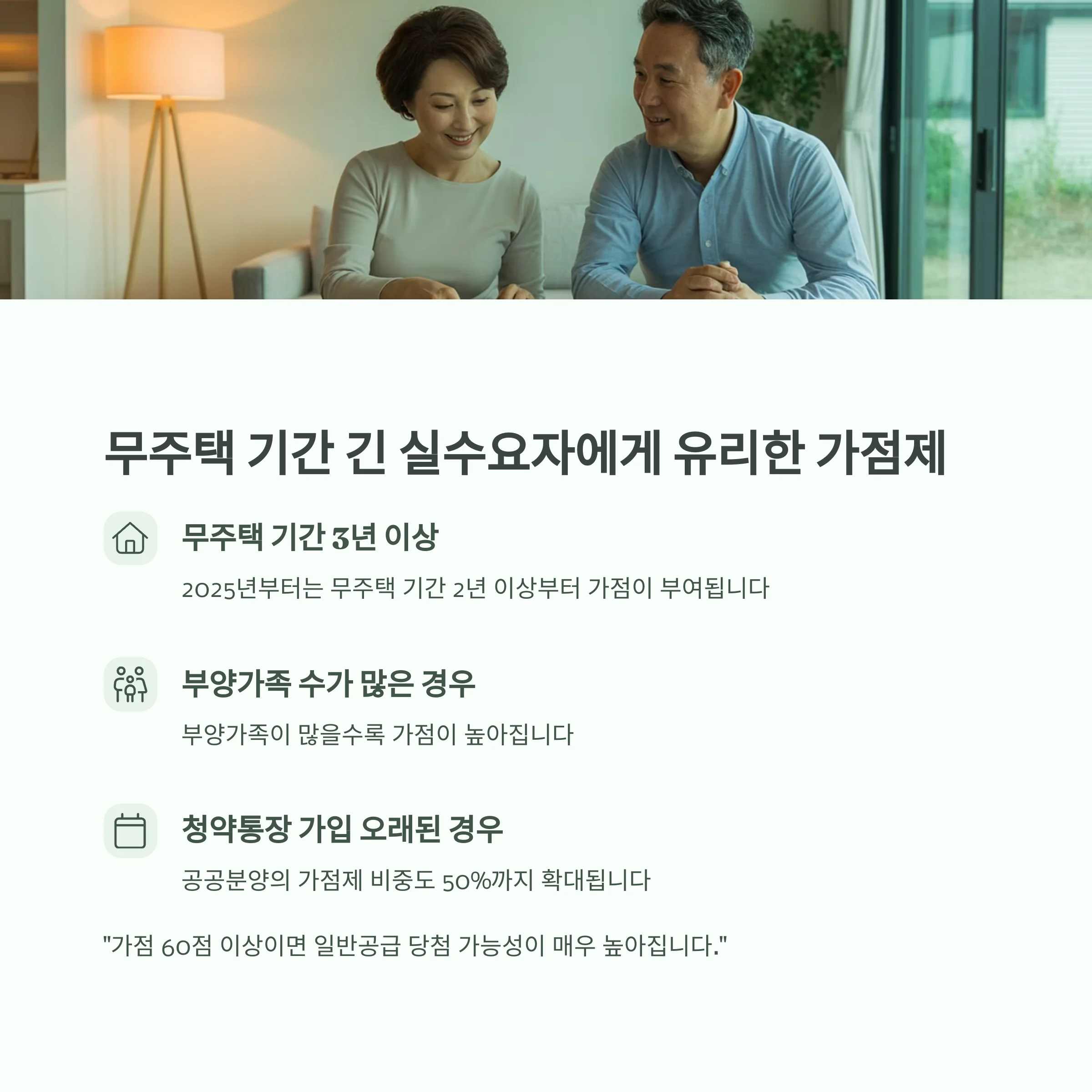 "가점 60점 이상이면 일반공급 당첨 가능성이 매우 높아집니다."