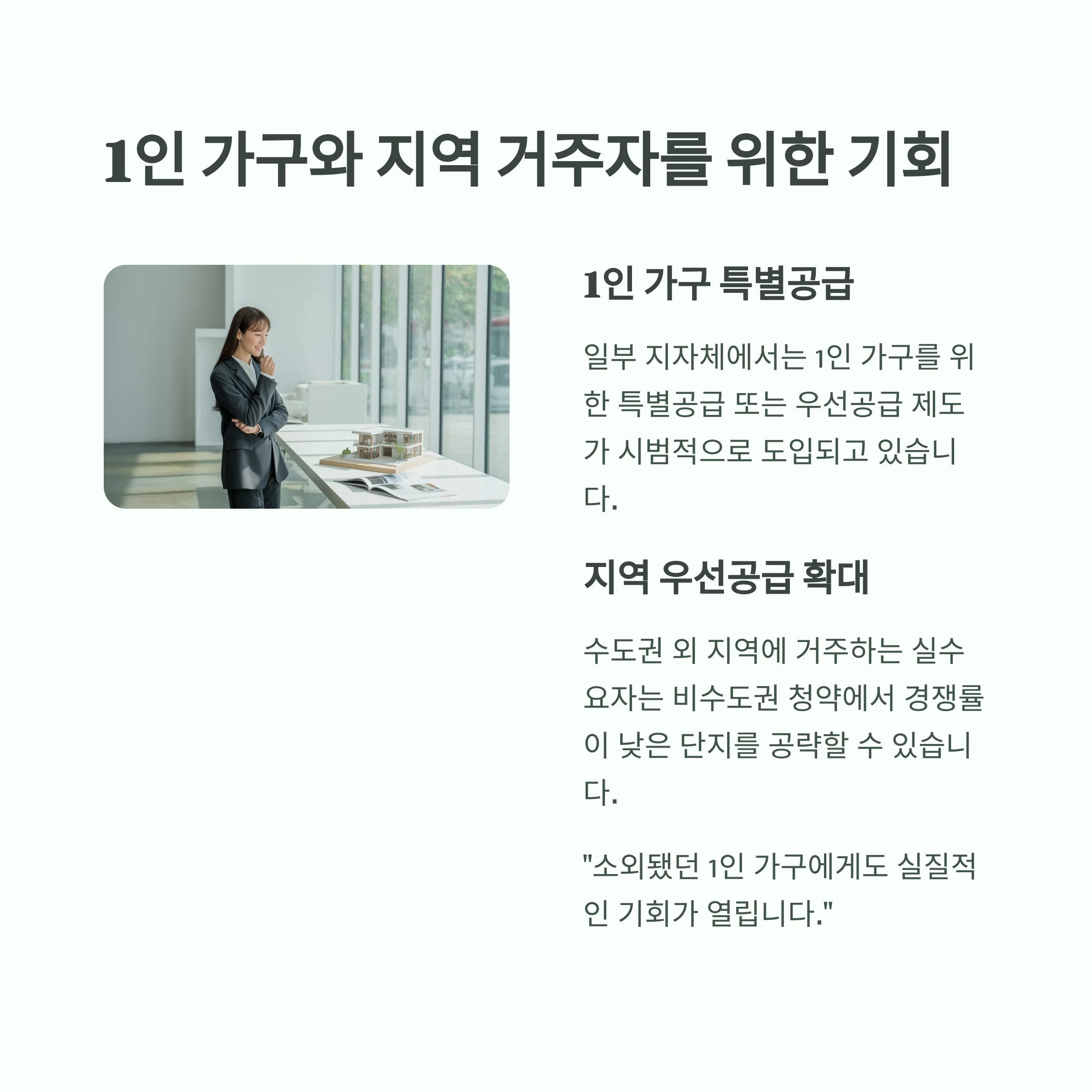 일부 지자체에서는 1인 가구를 위한 특별공급 또는 우선공급 제도가 시범적으로 도입되고 있습니다.