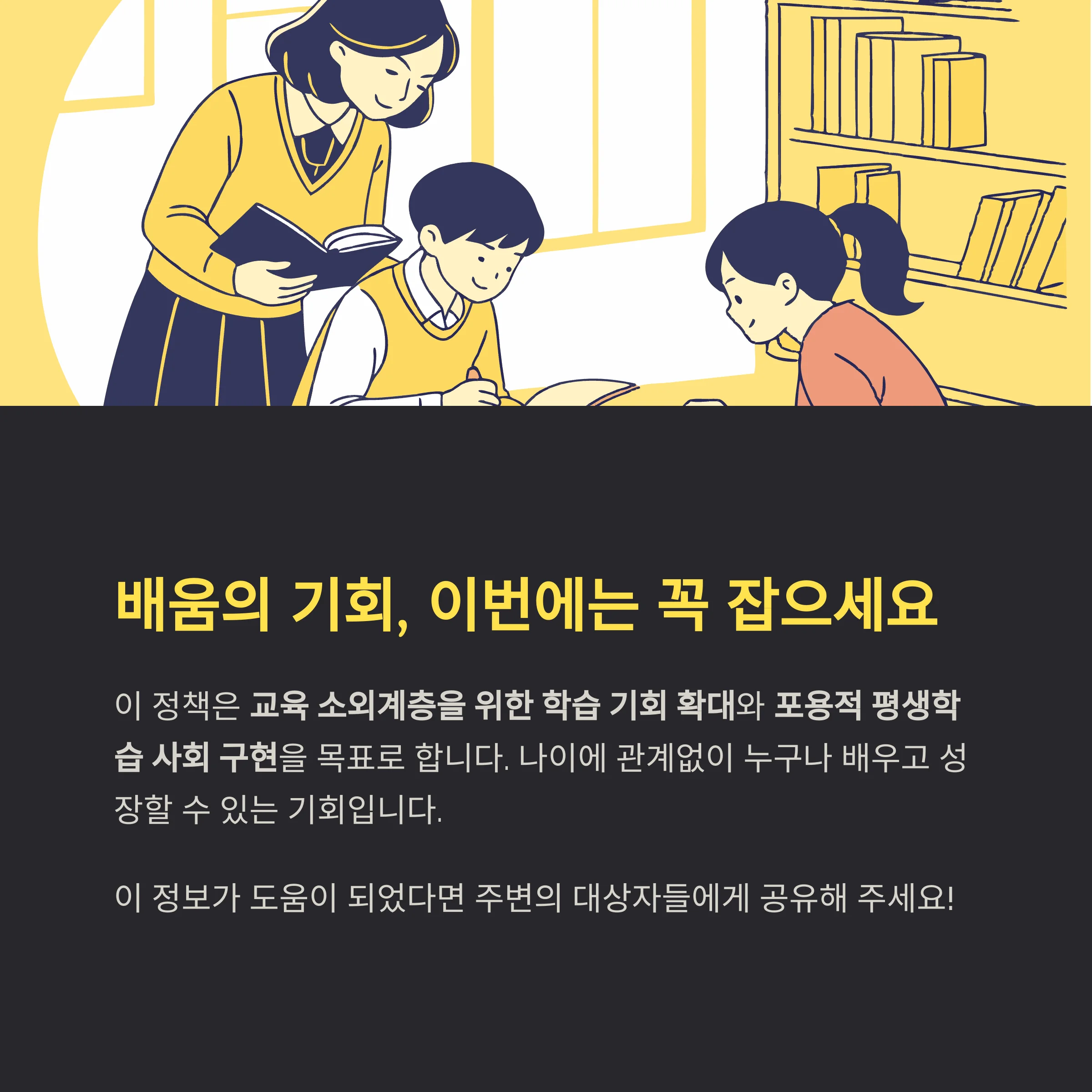 이번 정책은 교육 소외계층을 위한 학습 기회 확대와 포용적 평생학습 사회 구현이라는 목표를 실현합니다.