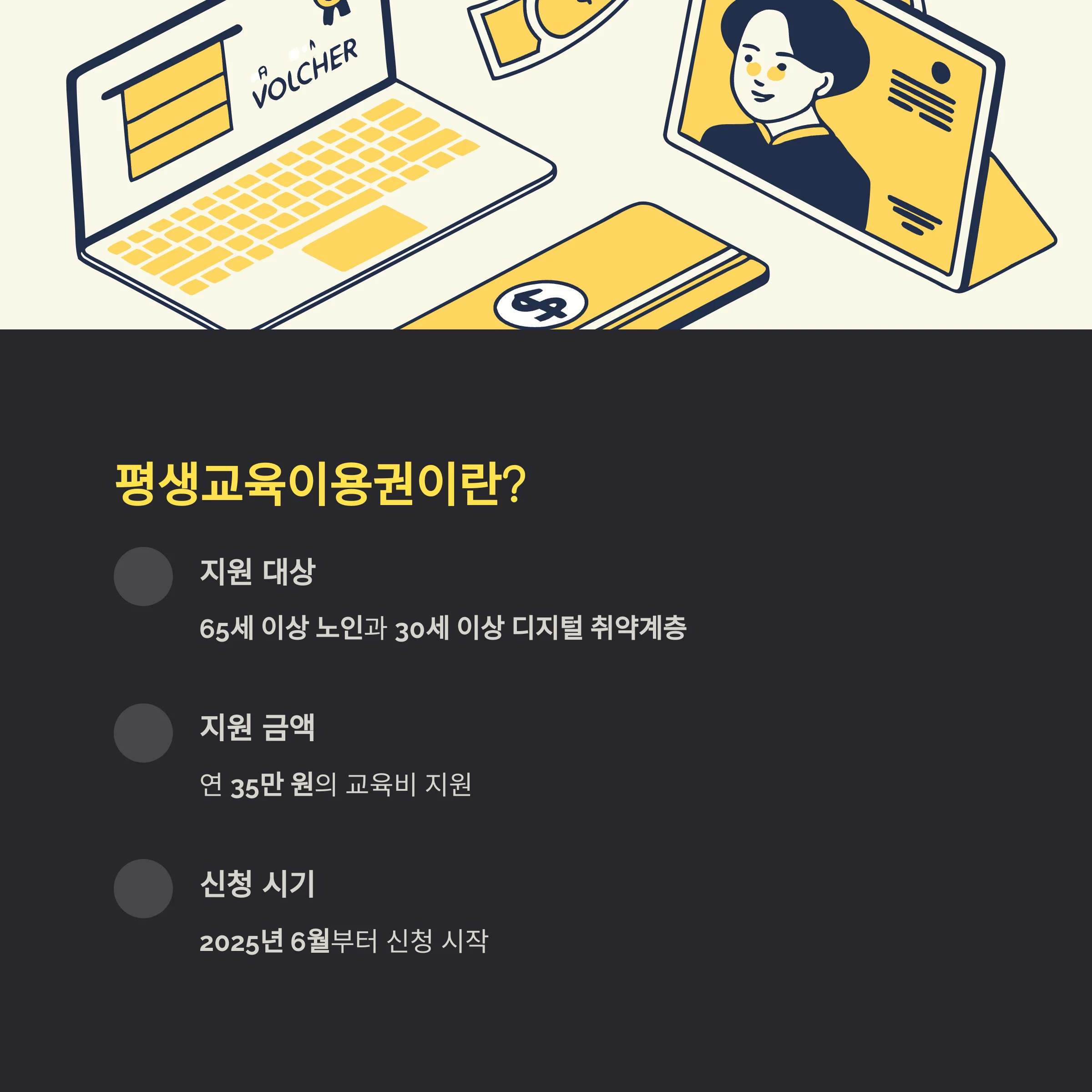 2025년 6월부터 노인과 디지털 교육 수요자를 위한 평생교육이용권 신청이 시작됩니다.