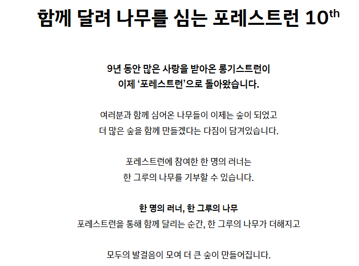 '포레스트런'은 참가자 한 명이 달릴 때마다 한 그루의 나무를 기부하는 '1인 1기부' 모델을 통해 지속 가능한 미래를 위한 친환경 활동에 동참하는 캠페인입니다. 이번 파이널런을 통해 총 5,000그루의 나무가 식재될 예정이며, 이는 현대자동차의 글로벌 CSV 이니셔티브 '현대 컨티뉴(Hyundai Continue)'의 일환으로 진행됩니다
