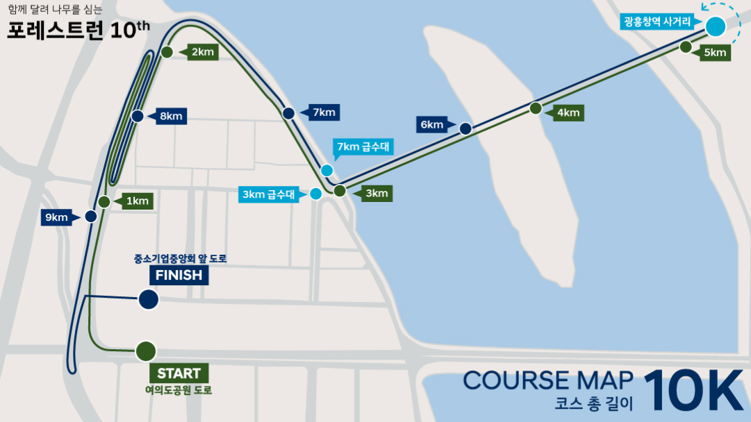 - 코스: 총 10km (여의도공원 → KBS → 국회의사당 → 서강대교 반환점 → 서울마리나 → 서울교 → KBS → 중소기업중앙회 앞 도로)