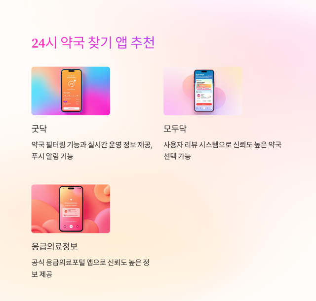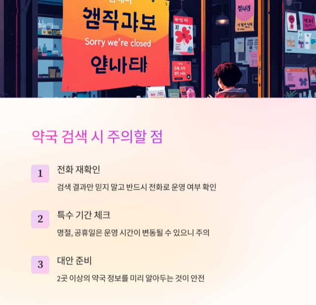 '우리동네 24시 약국 리스트'를 미리 검색해두는 것도 좋은 방법입니다.