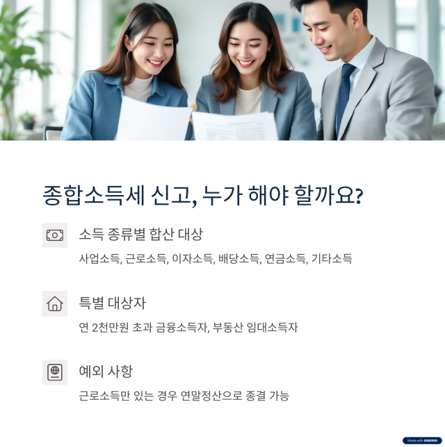 종합소득세는 소득 종류와 상관없이 소득이 발생한 대부분의 개인이 대상이 됩니다.