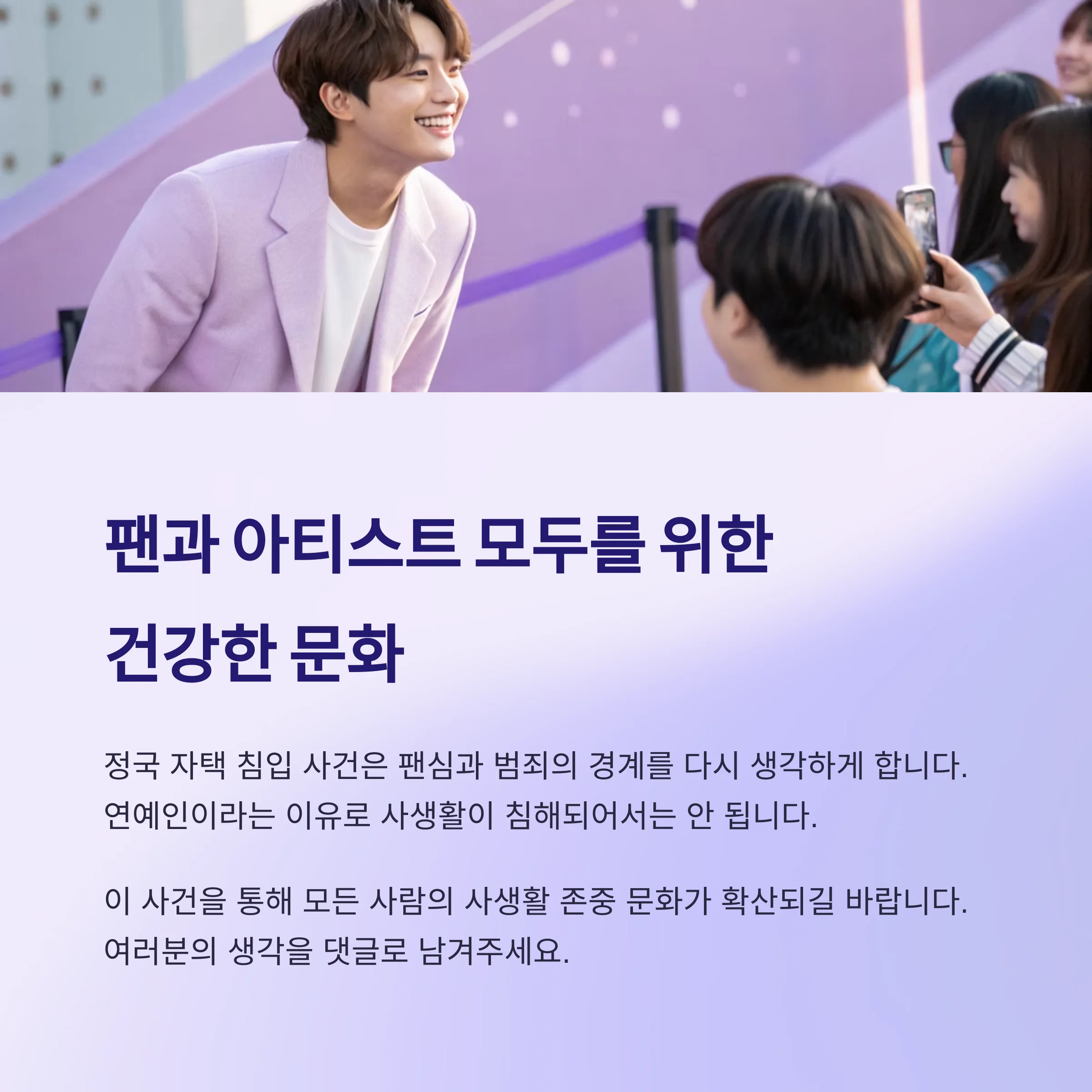 이를 위해 연예인이라는 이유로 사적 공간이 침해돼서는 안 된다는 공감대 형성이 필요합니다.