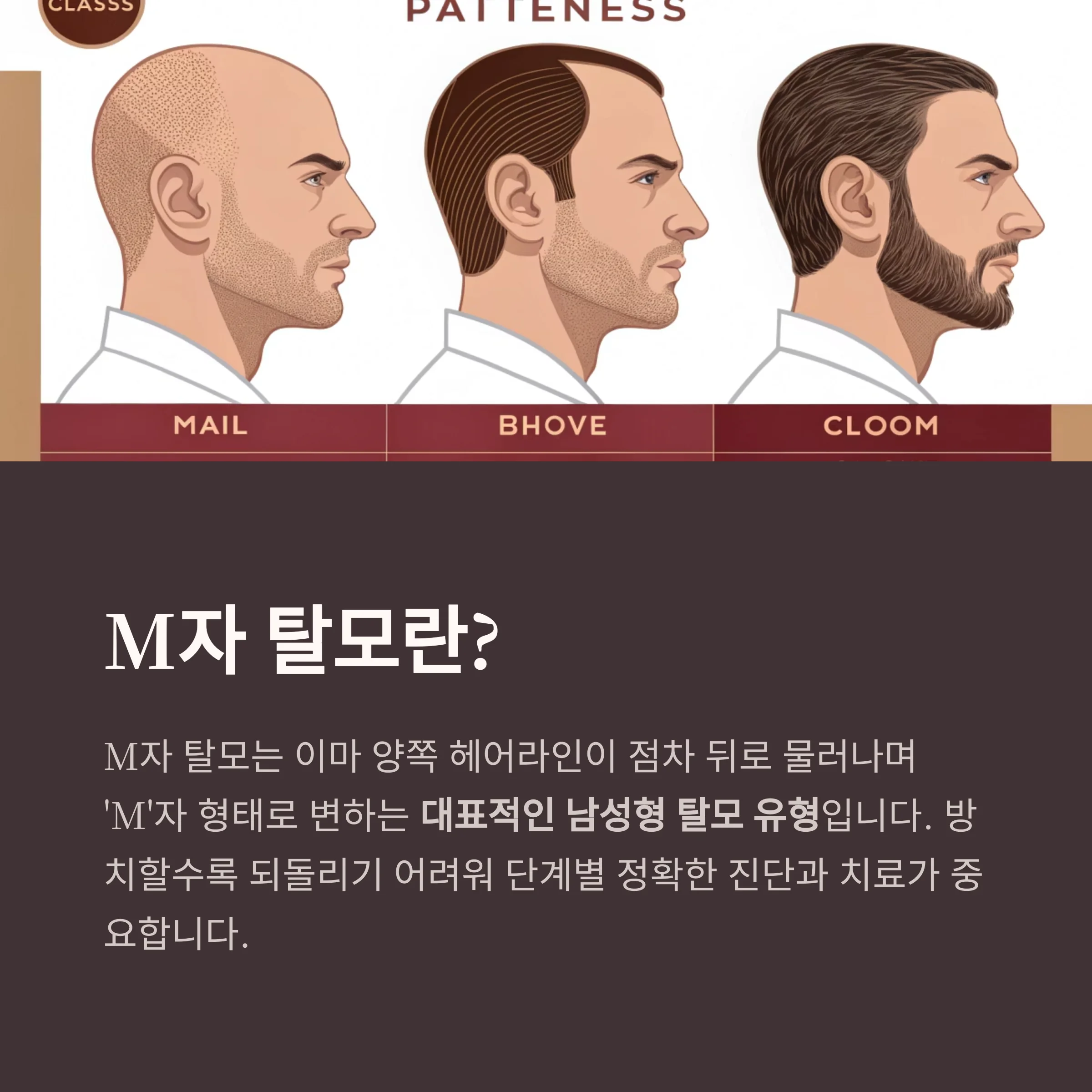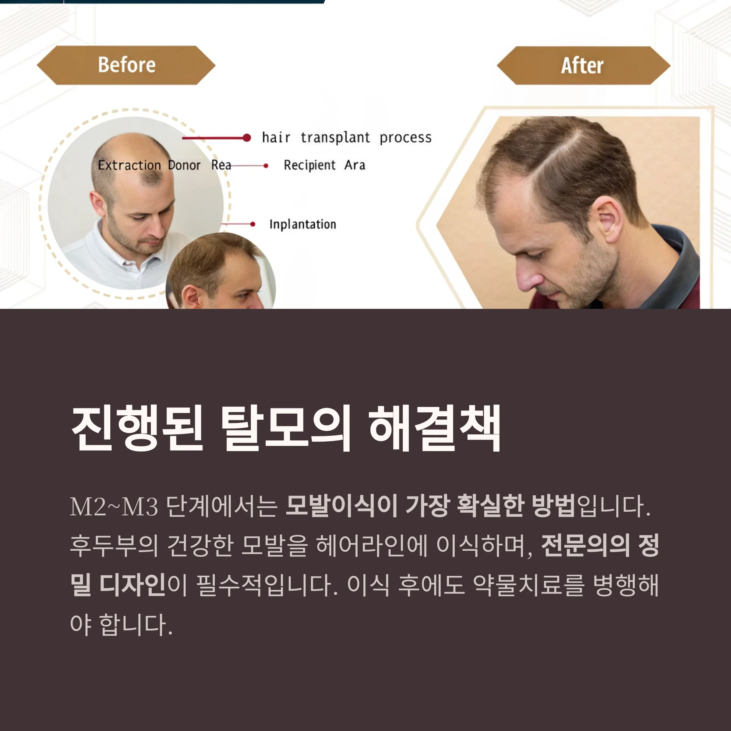 | M2~M3 | 헤어라인 후퇴 명확, 빈 공간 발생 | 모발이식, 약물 병행 |