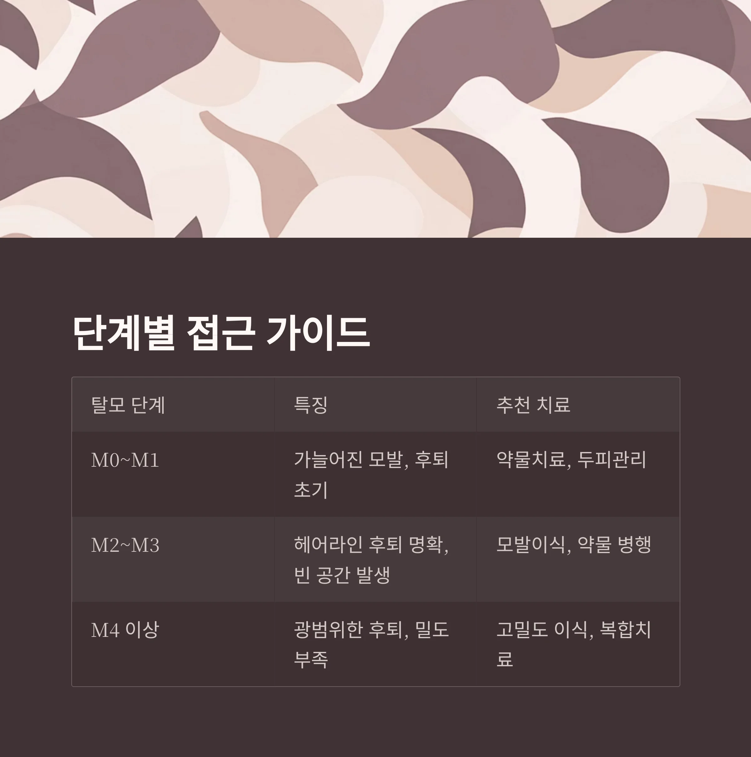 | M0~M1 | 가늘어진 모발, 후퇴 초기 | 약물치료, 두피관리 |