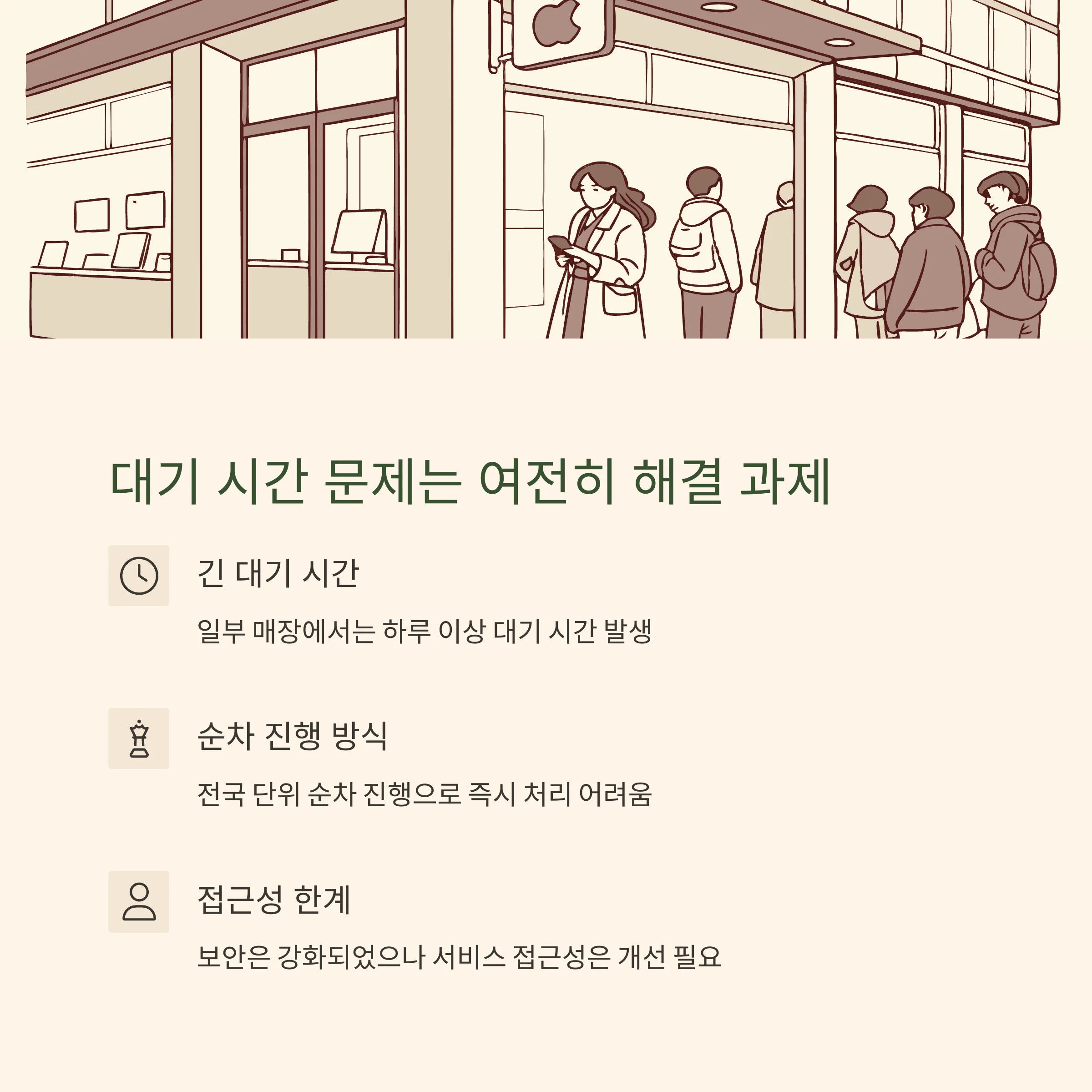 하지만 여전히 직접 매장 방문이 필수이고, 대기 인원이 많아 처리 지연 문제가 존재합니다.