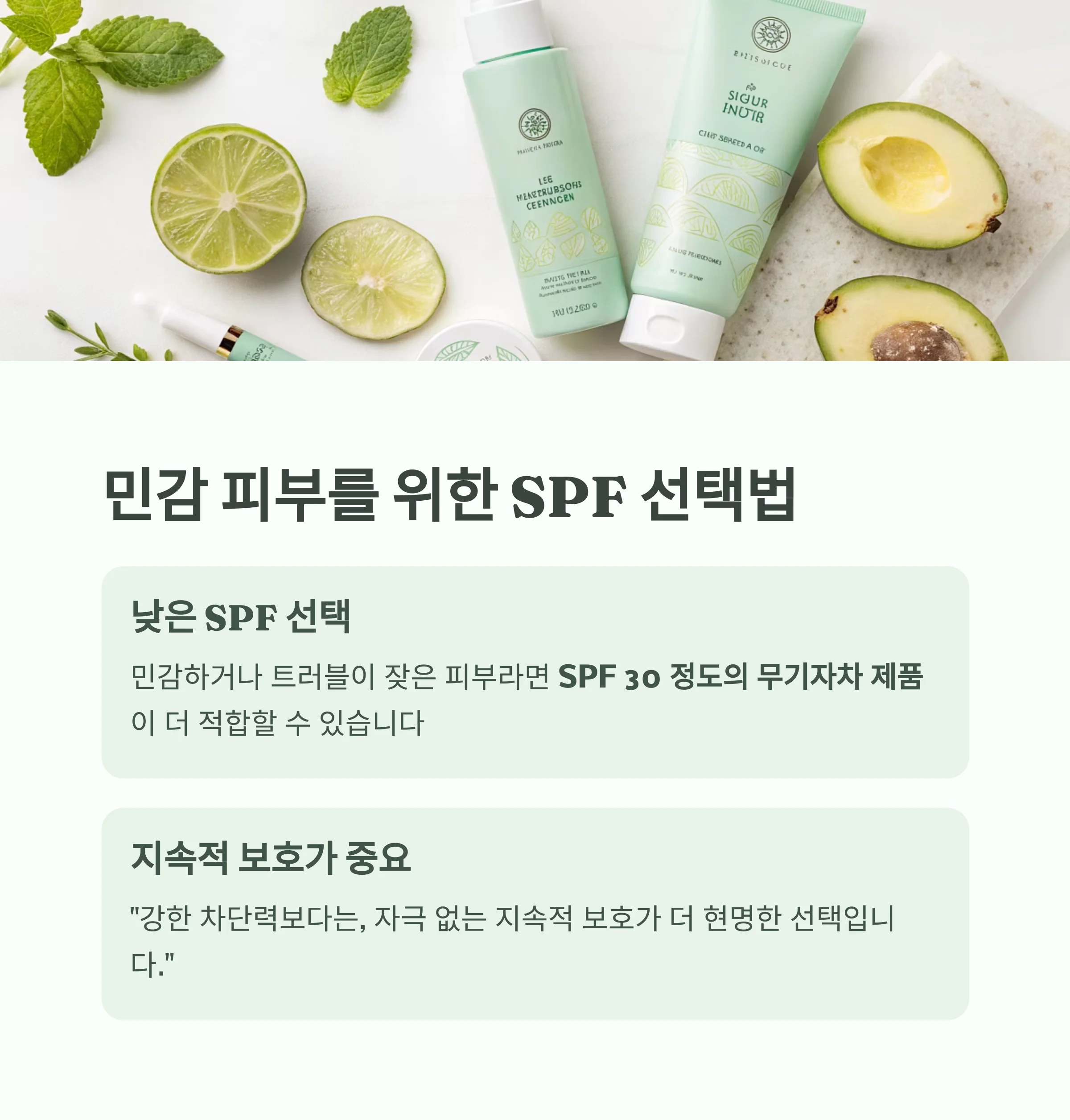 민감하거나 트러블이 잦은 피부라면 SPF 30 정도의 무기자차 제품이 더 적합할 수 있습니다.