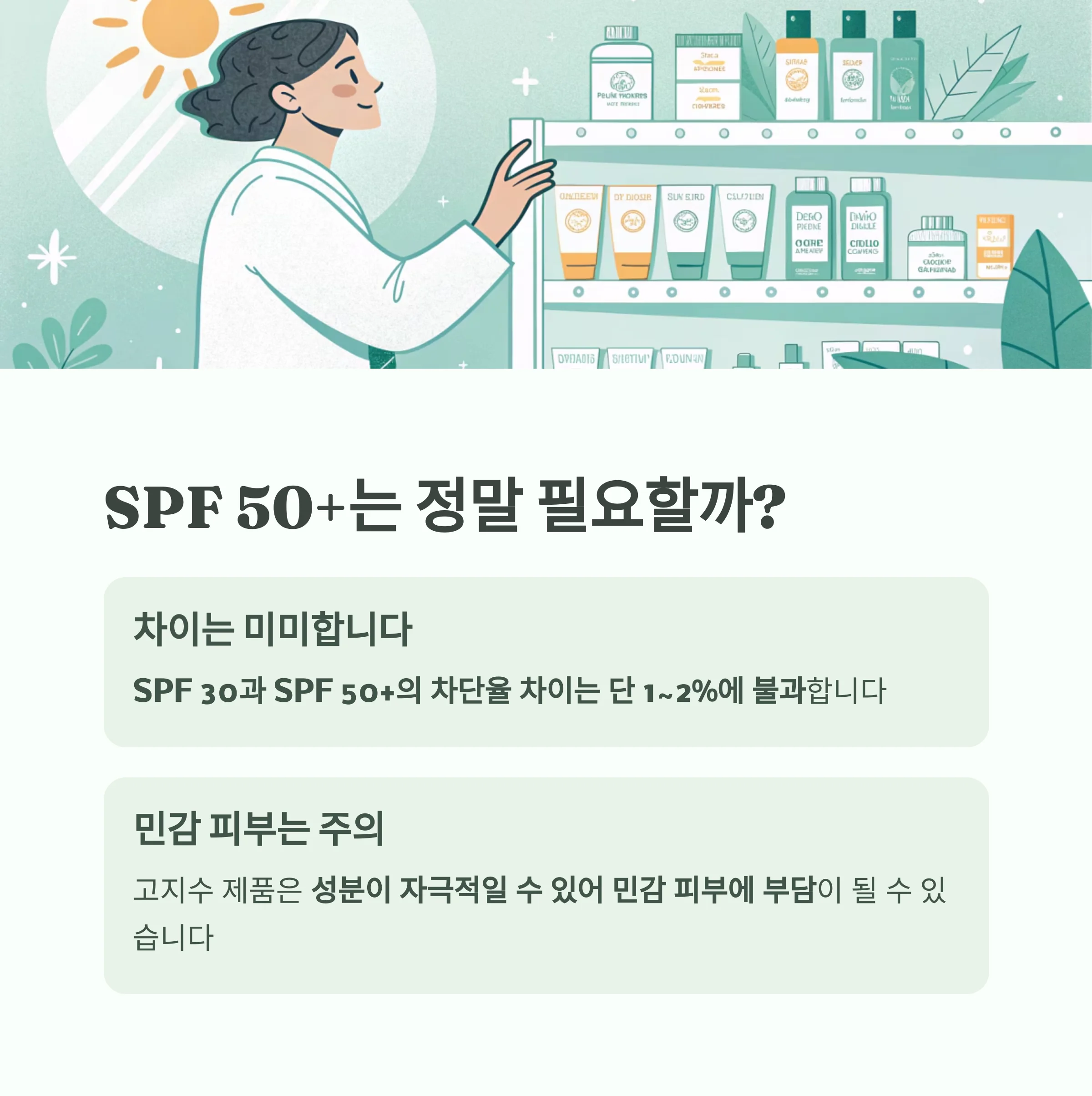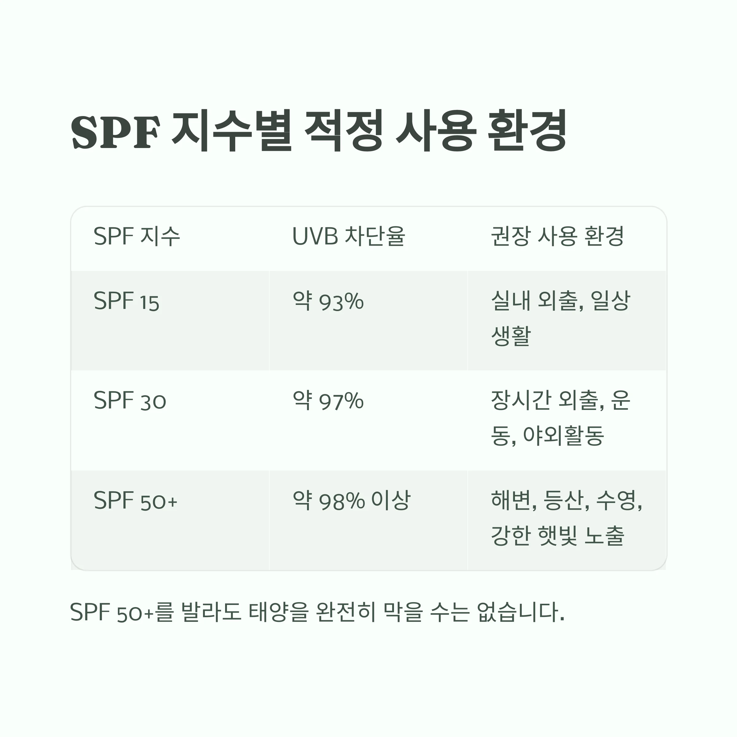 즉, 자외선 노출이 매우 심각한 환경이 아니라면 굳이 SPF 50+를 고집할 필요는 없습니다.