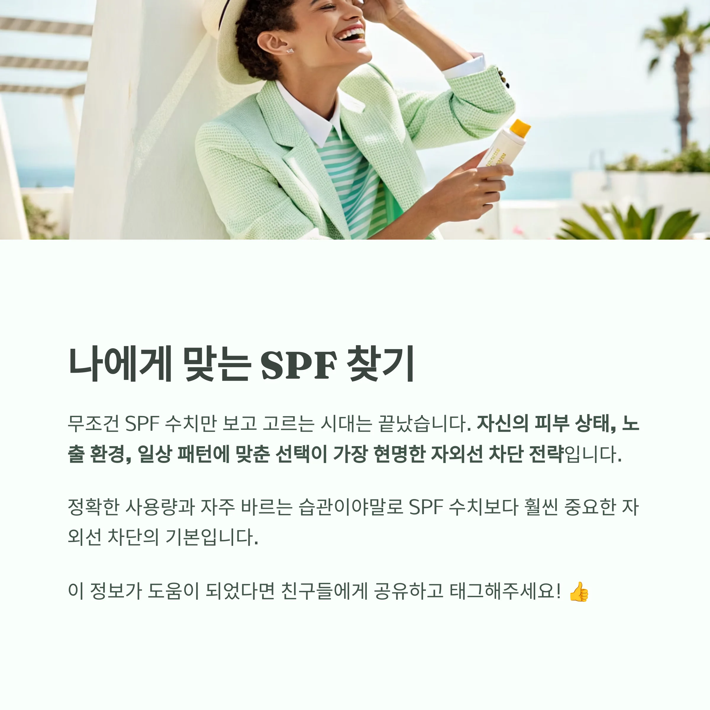 마지막으로, 정확한 사용량과 자주 바르는 습관이야말로 SPF 수치보다 훨씬 중요한 자외선 차단의 기본입니다.