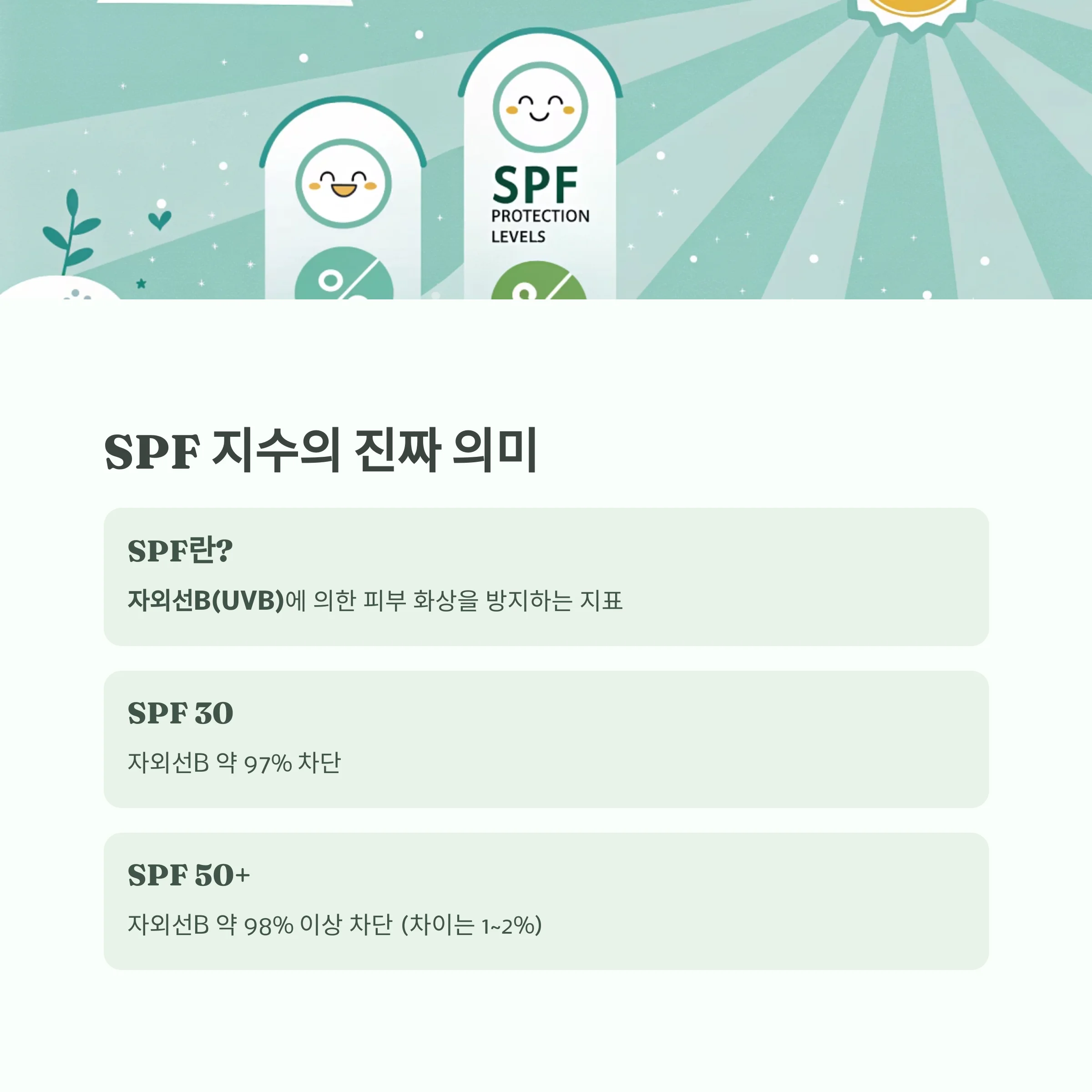 예를 들어 SPF 30은 자외선B로 인한 화상을 약 97% 막아주며, SPF 50+는 약 98% 이상 차단합니다.